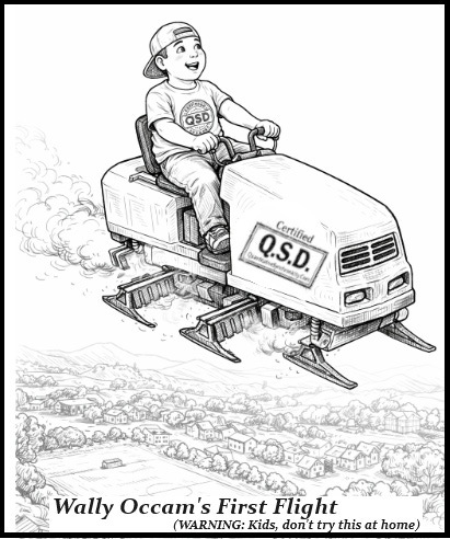 Since there were no laws against kids driving metaphorical devices, Mr. Occam had Wally practice flying the Occam Power Mower without the thrashers on. It was always "safety first" in the Occam household.
